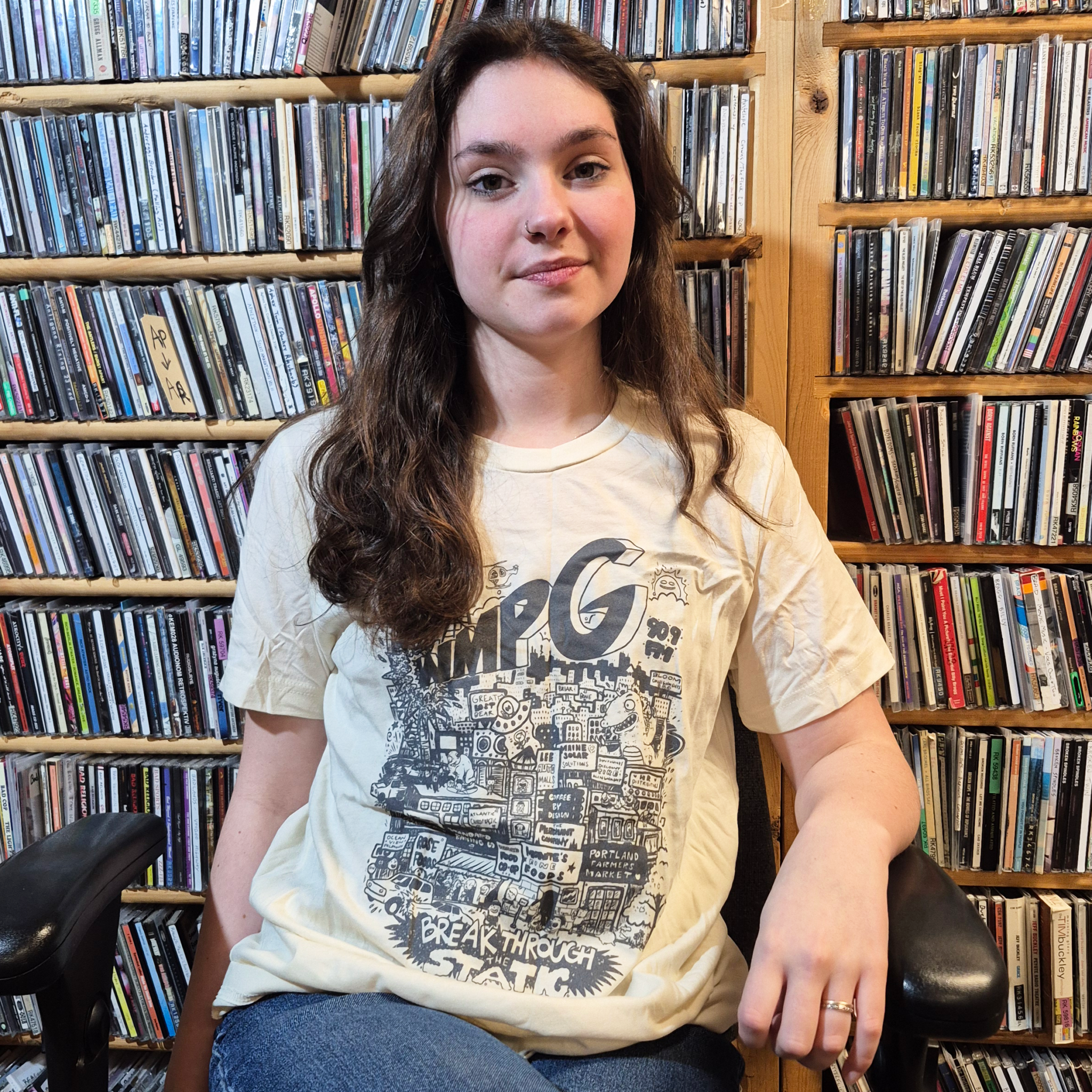 Break through the static with this WMPG cityscape t-shirt! A gray design on an off-white t-shirt displaying a city scene with the WMPG logo with the text “Break Through the Static”