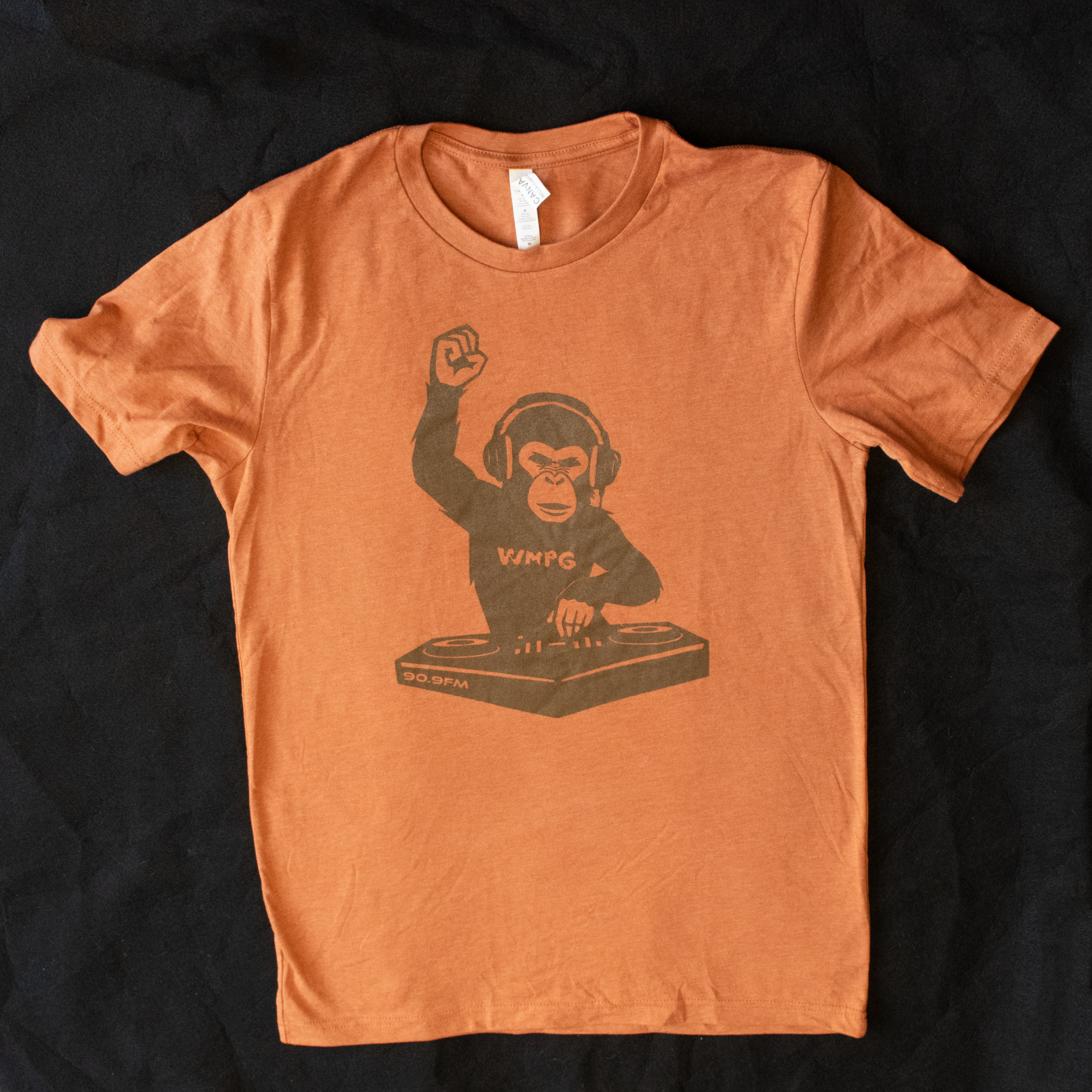 Represent WMPG with this orange t-shirt displaying a monkey DJing to their hearts’ content.